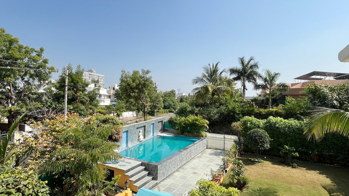 European villa in posh area🏡 -All tourist spots within 10-15mins📍 -4BHK 2 floors ⛲️ -Pool, Garden, Sky light, Indoor parking🏖️ -Minimal Boho tropical🌴 -AC 4king 🛌 , 4 🚾 -Kitchen with all utensils,gas,fridge🍽️ -Broad roads for your🚗 -200mbps wifi, 4 Smart 📺, CCTV👮♀️ -24/7 assistance 👩🏻💻 -NASA list of indoor 🪴 -Basic 🏋️♀️ equipment, toys🧸, rackets🏸 -Pichola lake:3km,Fateh Sagar:3.5km, City Palace:5km -Moneyback guarantee if we fail at any aspect💰 -Zomato, Blinkit
