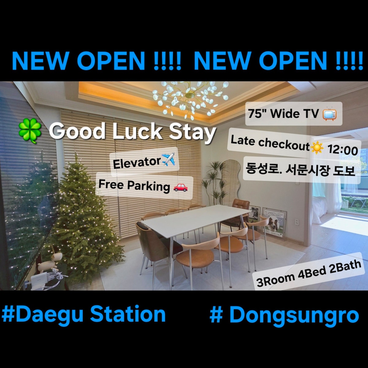 3 minutter fra T-banestasjonen i sentrum av Daegu/ 5 minutters gange til en gate med mange restauranter/ Rent sted som verten selv rengjør og vedlikeholder ⬙ Klikk på Se mer for å bekrefte beskrivelsen av overnattingsstedet og forholdsregler før du bestiller ⬙ - Innsjekking kl. 16.00, utsjekking kl. 11.00 - Tårnformet betalingsparkering i bygningen (15 000 KRW per dag) - Ingen kjæledyr tillatt - Røyking er strengt forbudt i boligen (alle utgifter som påløper ved røyking vil bli belastet) Hvis du åpner korridorvinduet i bygningen og røyker, blir det automatisk registrert på 119. - Ved ufjernbar forurensning/skade på eiendeler/tap/tyveri i rommet, kan du kreve erstatning for gjenstands- og vaskekostnader gjennom en AirCover-søknad (kontakt verten umiddelbart) - Unngå å feste klistremerker eller tape på grunn av tapettskader. (Ingen fester) - Det er forbudelatt å tilberede mat med sterk lukt og oljeflekker, slik som svinekjøtt, sjømat og fisk. - Vennligst unngå støy etter kl. 22.00 for naboene - Kansellering og endring av reservasjoner er kun mulig inntil 5 dager før oppholdet (Full refusjon opp til 5 dager før oppholdet)