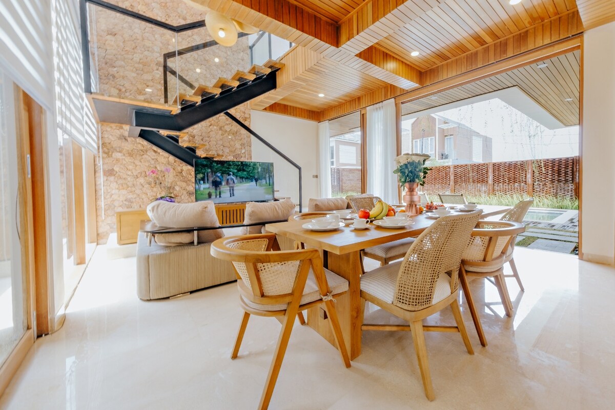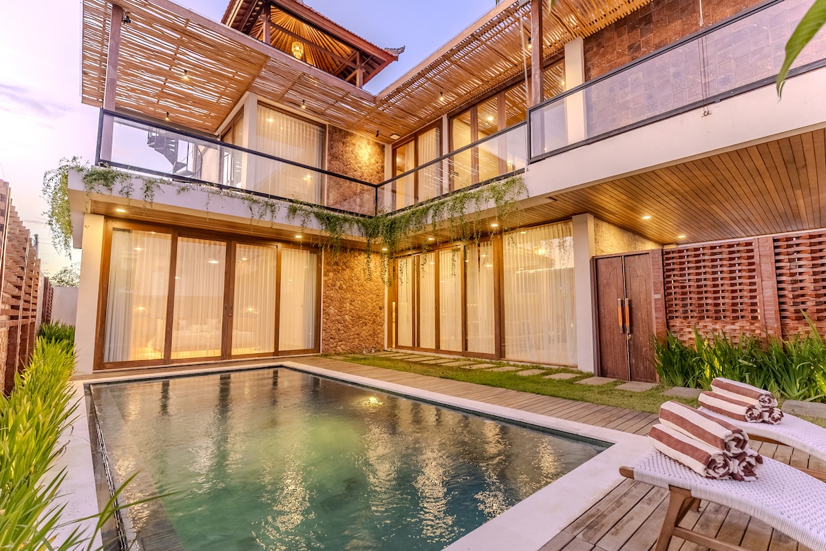Designervilla med ett soverom omgitt av natur i Ungasan: • gulv-til-tak-vinduer som åpner seg til en privat hage • Soverom i jordfarger med arkitektoniske detaljer • Spa-inspirert bad med dusj • Privat turkist basseng • Overbygd utendørs stue med pendellamper. • fullt utstyrt kjøkken og spisestue • 300 Mbps trådløst nettverk • daglig rengjøring • Netflix, PS5 og babyfasiliteter på forespørsel • concierge for transport, scooterutleie og øyaktiviteter • kjæledyrvennlig • IDR 500 000 i refunderbart depositum