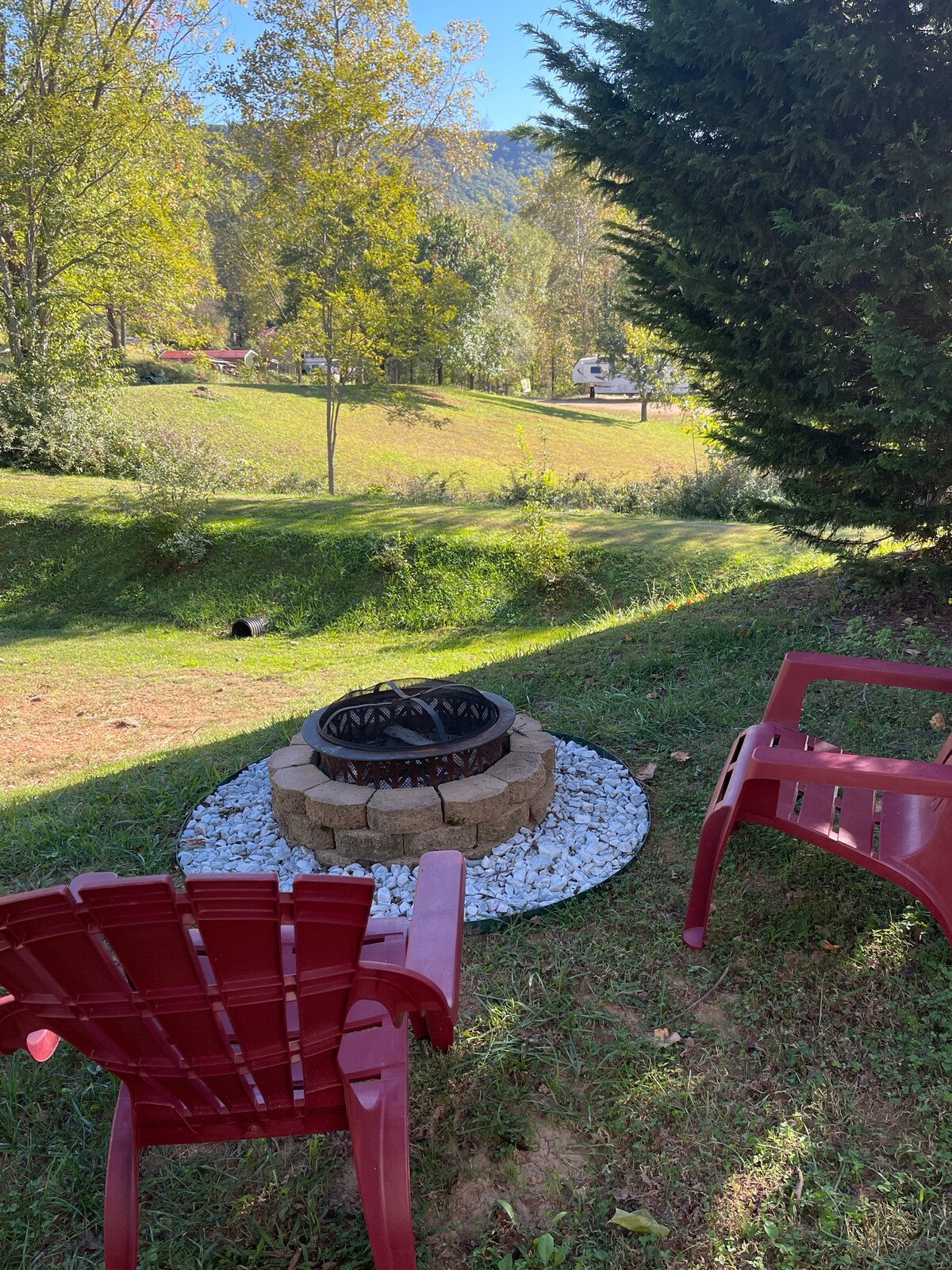 Det er en 2021, 30' campingvogn med en sklie og fullt utstyr. Du har en flat plen i solen og skyggetrær helt for deg selv med et bålsted og utendørs sitteplass å nyte. Vi ligger bare fem minutter fra Asheville flyplass, og midt mellom Asheville og Hendersonville, og det tar 20 minutter å komme seg til begge sentrum. Du kan nyte mange av de nærliggende skogene: Bent Creek og Mills River ligger 15 minutter unna, Pisgah og DuPont ligger 30 minutter unna. Det er en morsom opplevelse!