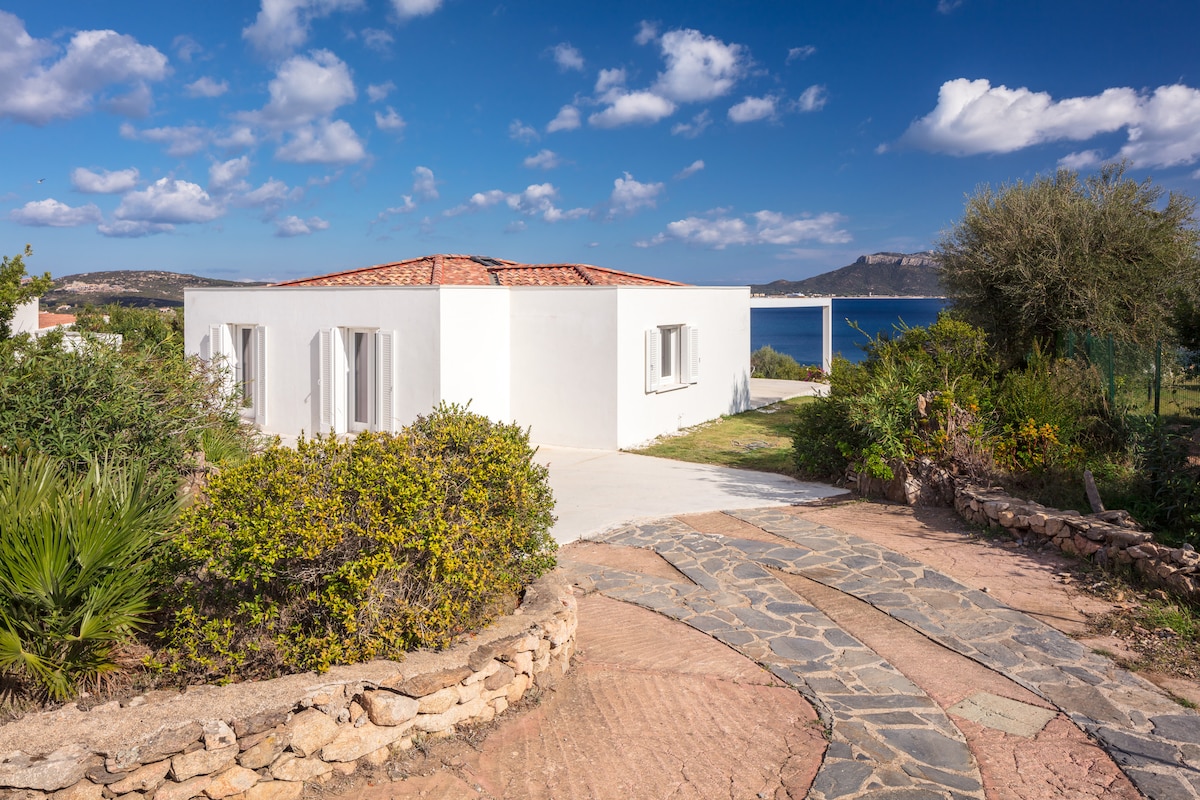 Lyst hus med utsikt over havet omgitt av sardinsk skrubb