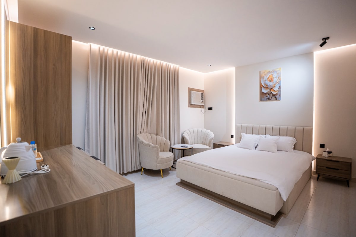 Nyt et eksepsjonelt opphold i denne luksuriøse leiligheten som kombinerer den moderne karakteren og den kulturelle identiteten til Qassim-regionen. Nøye designet for å gi deg en følelse av varme og tilhørighet, med dekorative detaljer inspirert av elegante farger og former for arv, blandet med elegante hotelldetaljer. Leiligheten har tre stilige og komfortable soverom, et fullt utstyrt kjøkken med alle nødvendige verktøy og apparater for å tilberede måltidene dine med komfort, samt en eksklusiv stue med luksuriøse brenneviner og tre moderne bad med elegante overflater som tilbyr maksimal komfort og privatliv.