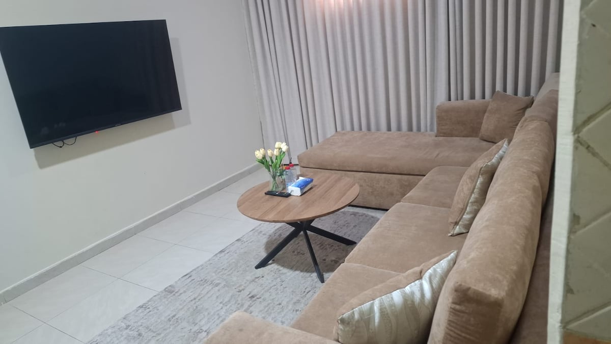 Elegant hotelleilighet i Al Rayyan-nabolaget – Mughni-prosjektet, med moderne design og fullt møblert. Perfekt for familier eller besøkende på jakt etter hvile og ro. 🛏️ To soverom (tre separate senger). 🛋️ Romslig hall Integrert 🍽️ kjøkken 🚿 2 bad. 📺 Smartskjerm som støtter krypterte treff 🎮 Netflix + YouTube 📶 Trådløst nettverk uten ekstra kostnad. 🚪 innsjekking uten vert Privat🅿️ parkering uten ekstra kostnad. Tilgang og avslutning av robusthet 📍 Skritt fra Boulevard, Al Bukhari og alle tjenester. 🔒 Komfortgaranti: Hvis leiligheten er annerledes enn bildene eller mindre, refunderer vi hele beløpet uten diskusjon.