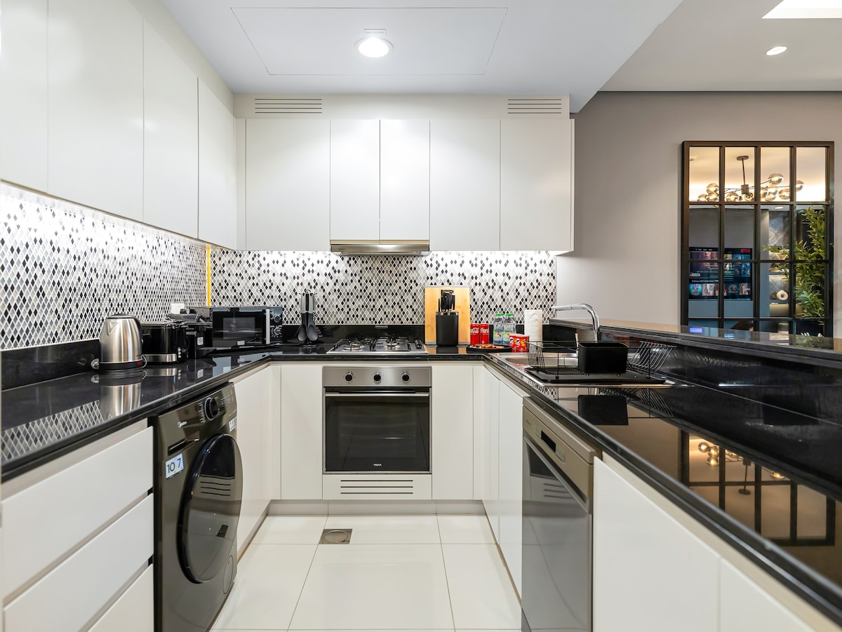 Velkommen til hjemmet ditt i hjertet av sentrum av Dubai, ideelt for familier og grupper som søker plass, komfort og bekvemmelighet. Denne moderne leiligheten med fire soverom har lyse oppholdsrom, 70-tommers smart-TV, et fullt utstyrt kjøkken og en privat balkong med vakker utsikt over byens skyline. Viktige funksjoner: ✔ 5–10 minutter til Dubai Mall. ✔ Dubai-fontenen og Burj Park ✔ Emaar Boulevard-kaféer og familierestauranter ✔ Enkel tilgang til T-bane og taxi. Nyt et lyst, stilig opphold der luksus møter komfort i Dubai sentrum.