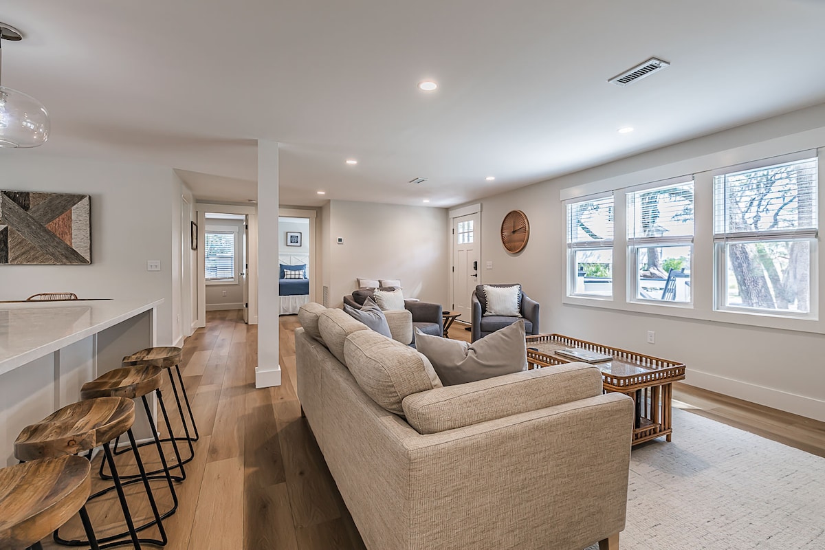 Reis til The Hideaway, et nybygd moderne tosoveroms-/totobadsferiested ved vannet på St. Helena Island. Denne arkitektonisk unike hytta er omgitt av levende eiketrær og feiende utsikt over saltmyrene, og blander luksus og natur med kuraterte fasiliteter, inkludert en privat innendørs badstue. Fredelig og avsidesliggende, men likevel bare minutter fra strender, friluftseventyr, lokale butikker og spisesteder – designet for hvile, gjenforening og fornyelse.