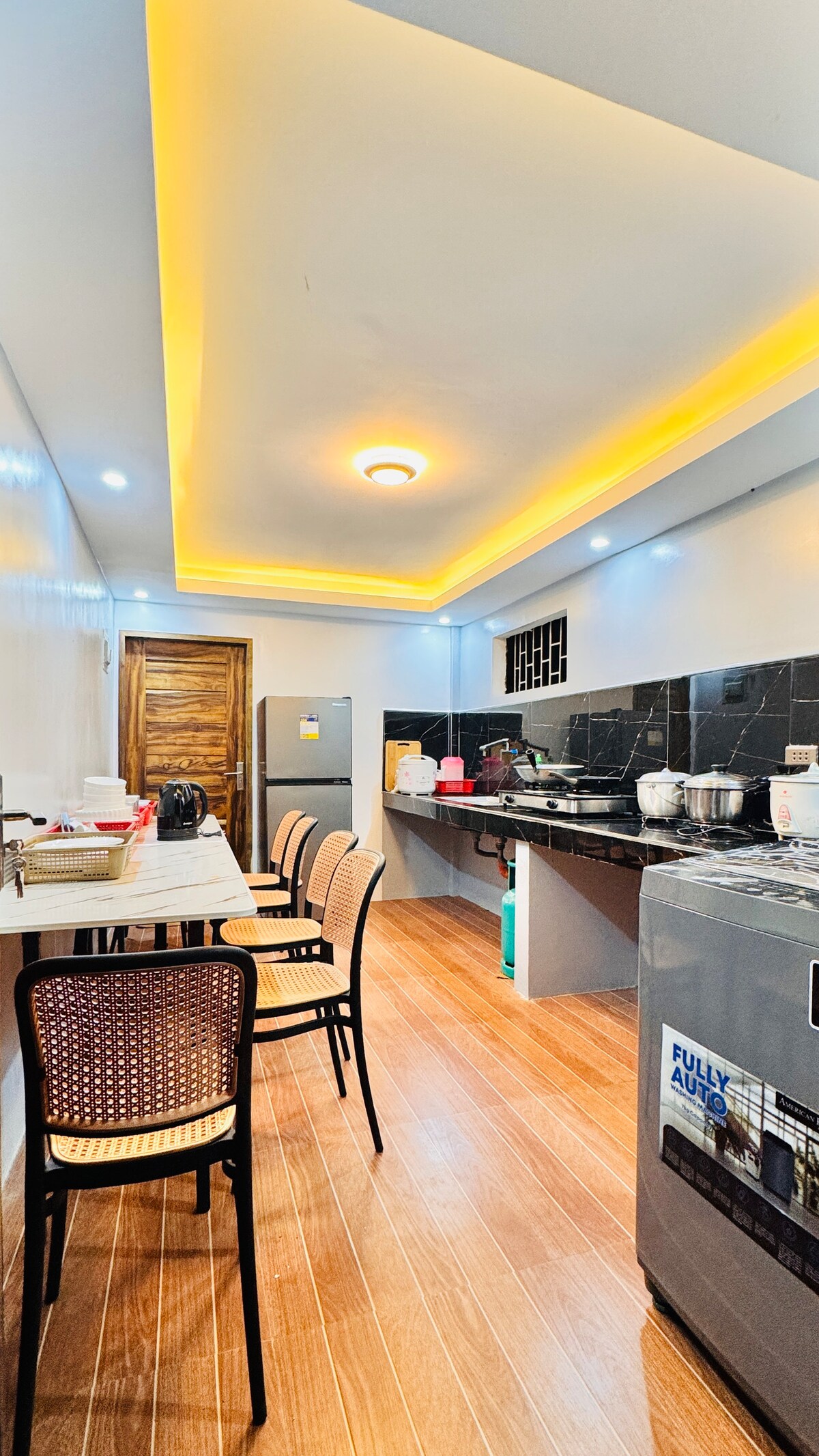 Dette er en overnattingstype for HJEMMEFERIE. Eksklusivt, helt hus for gruppen din med eget kjøkken du kan bruke. Det er også en stue med 65 tommers smart-TV for Netflix, Youtube og Videoke med JBL Party Box-høyttaler. Fullt klimaanlegg og varm og kald dusj på hvert rom, fire soverom. Beliggende i Coron Town-området.