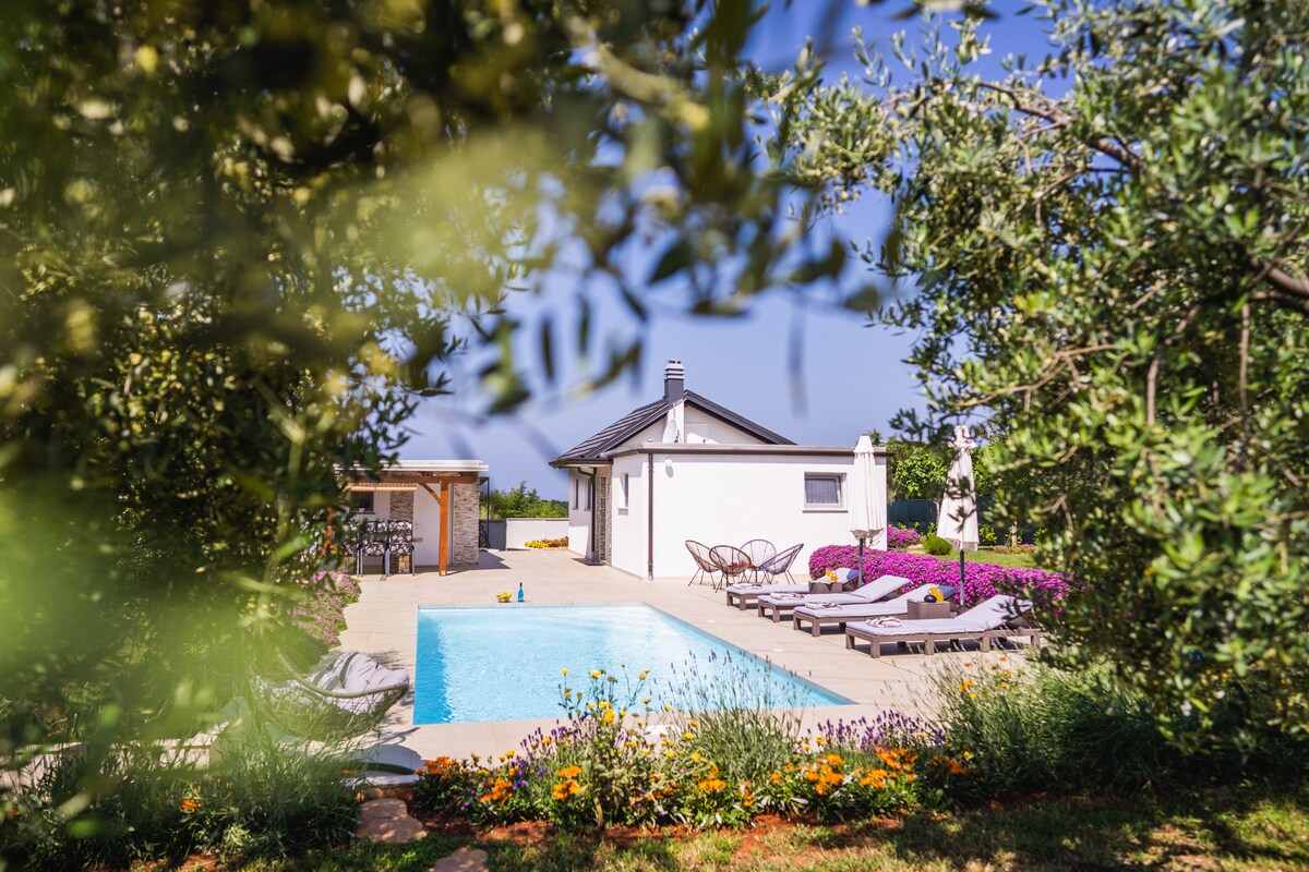 Villa Villetta – sjarmerende Istria-ferie Villa Villetta er perfekt for en familie med 2+2 barn, og den har ett soverom, et bad, stue med en dobbel sovesofa og et fullt utstyrt kjøkken. Nyt ditt eget 15 kvm store basseng, boblebad, solterrasse, lounge og grillområde, alt i en vakkert anlagt hage. Privat parkering er inkludert. Slapp av, slapp av og få mest mulig ut av Istria-ferien din!