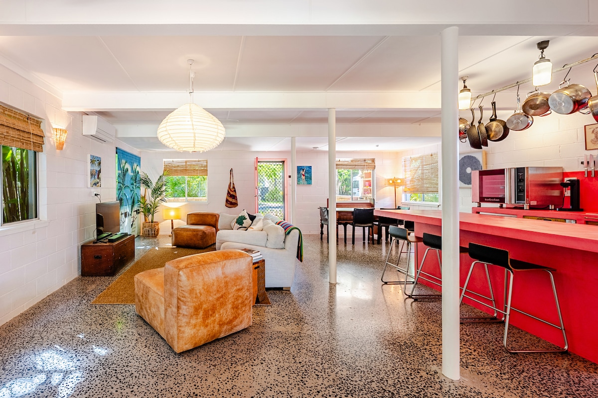 Opplev å bo helt ved stranden på Pearl House på Tallows. Dette feriehjemmet i Suffolk Park med fire soverom har direkte tilgang til Tallow Beach, et magnesiumbasseng, spa, infrarød badstue, pizzaovn og frodige tropiske hager. Bare syv minutter til Byron Bay, det er den perfekte kystferien for familier, venner og kjæledyrvennlige opphold.