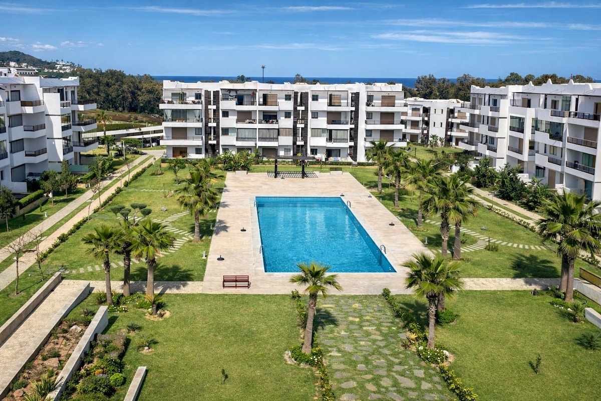 Drømmeleilighet med havutsikt og basseng i Cabo Negro, Marokko. Master-suite, barnerom, utstyrt kjøkken, lys stue med tilkoblet TV, spisestue for 8 personer. Bolig med to store bassenger, sklie, minifotballbaner, lekeplass. Rask tilgang til strand, restauranter, butikker, badeland, quad, hest, golfbane. Parkering og leveringstjeneste (Glovo) tilgjengelig. Ideelt for familieferier. Vær oppmerksom på at bassenget ikke er i drift om vinteren fra 1/10 til 15/5