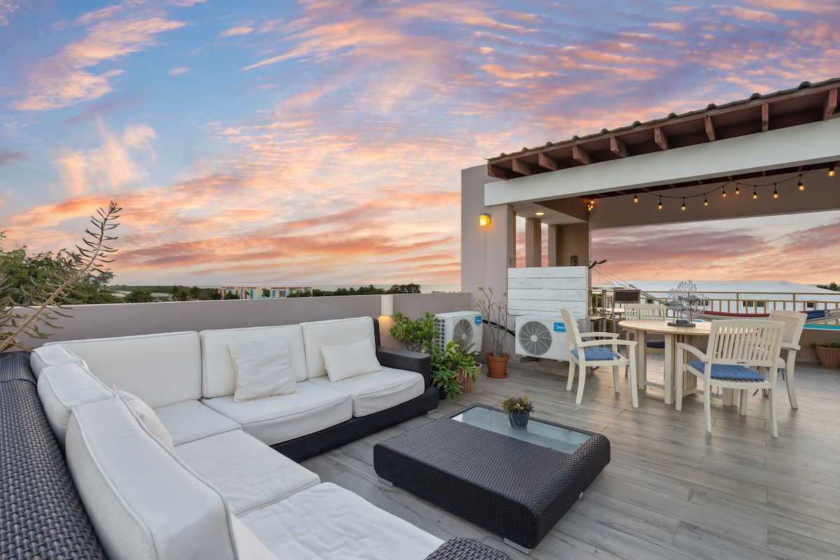 Tropisk toppleilighet med solnedgang • Takterrasse og boblebad
