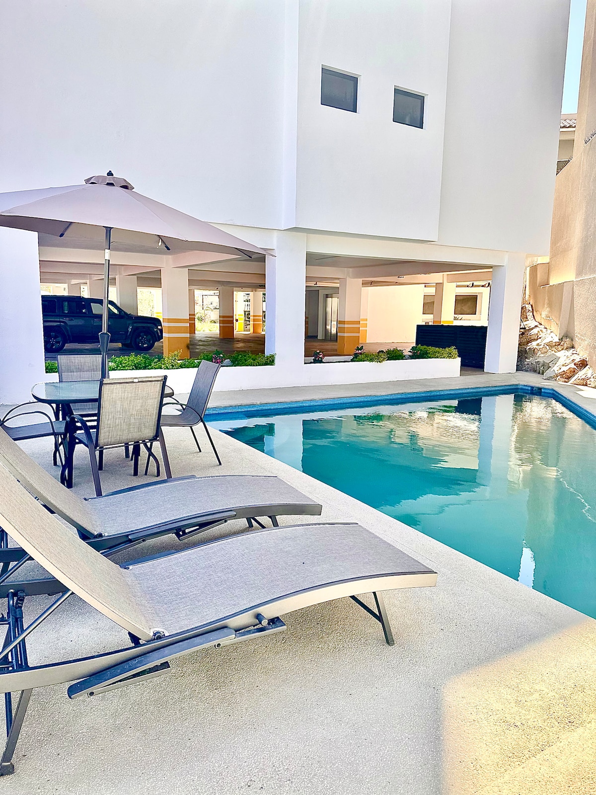 Komfortabelt og trygt sted å bo, ideelt for fire personer. En uslåelig beliggenhet: fire minutter fra La Marina, fem minutter fra Playa El Médano Fullt klimaanlegg, med – To soverom med kingsize-senger, – to komplette bad - utstyrt kjøkken - terrasse Fellesarealer med - swimmingpool, – Steakhouse, - takterrasse. - gratis parkering - Heis – Elektronisk lås for innsjekking uten vert. 35 minutter fra flyplassen (SJD). Vi har et utendørs overvåkningskamera ved hovedinngangen.