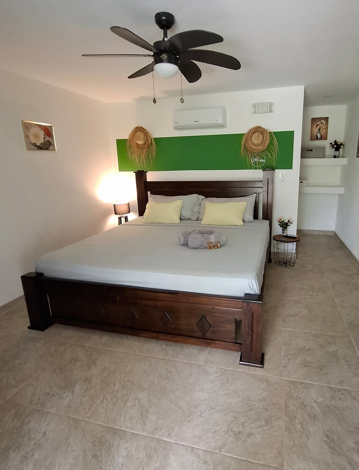 Fra denne beliggenheten på toppen av bakken over Tamarindo Bay, vil du nyte en panoramautsikt som er utrolig. Du vil se hva vi mener når du kommer hit! Casita tilbyr en kingsize-seng og en nedtrekkbar queen-seng, fullt utstyrt med et privat bad, kjøkken og en liten balkong med havutsikt og perfekt for å se aper i de omkringliggende trærne! Du har også tilgang til eiendommens sosiale område, inkludert en luftig, overbygd terrasse ved bassenget med havutsikt og takterrassen!