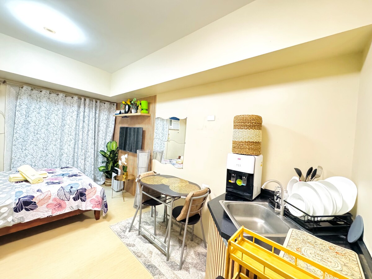 ☑ Hotellinspirert, fullt møblert studioenhet. ☑ Alt er helt nytt på rommet. ☑ Nydelige svømmebassenger + treningsstudio. ☑ Se Macajalar Bay fra vinduet. ☑ Gå fem minutter til SM Downtown Premier, Ayala's Centrio og Gaisano kjøpesentre. ☑ Komfort, bekvemmelighet og ro i sinnet. ☑ Generøse åpne områder + sikkerhet døgnet rundt. ☑ To minutters spasertur til Lifestyle District (musikk + spisestur + gastropub). ☑ Sentralt plassert med to tilgangspunkter, hver med 7-Eleven butikker.