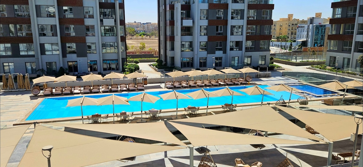 Slapp av og nyt oppholdet ditt i denne stilige leiligheten i første etasje med to soverom og en privat hage i Stone Residence, New Cairo. Perfekt for familier eller forretningsreisende, med direkte tilgang til grøntområder, bassenger og et trygt, inngjerdet område bare noen minutter fra Cairo Festival City. Høydepunkter: – første etasje med privat hage og terrasse – familievennlig, moderne interiør – Inngjerdet område med bassenger, grøntområder, kafeer og barneområder. – sikkerhet døgnet rundt og gratis parkeringsplasser - trådløst nettverk med høy hastighet.