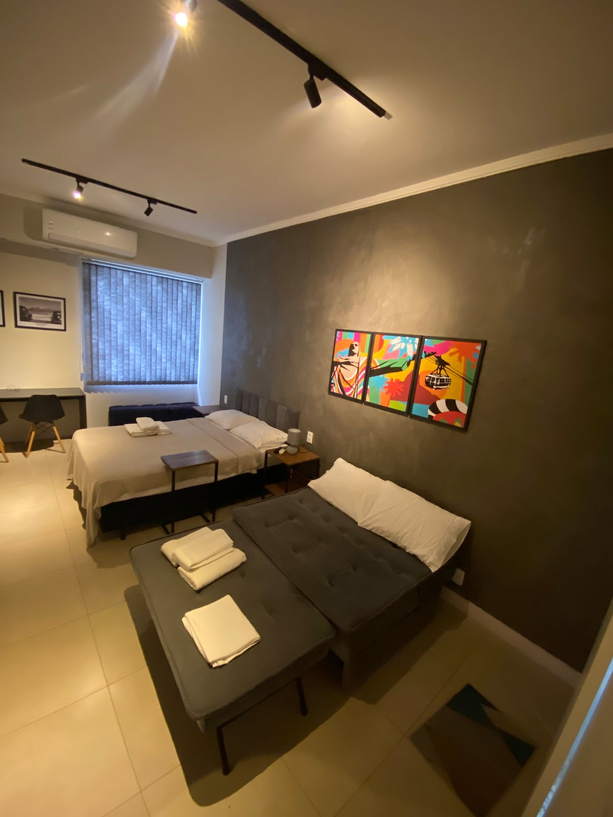 Velholdt studio i en moderne bygning med basseng, grillplass og treningsrom. Har en queensize-seng, trådløst nettverk og en balkong med kveldssol og en vakker utsikt mot Arcos da Lapa. Gangavstand til: – 5 min: Cinelândia Metro, Catedral Metropolitana, Selarón Steps, Santa Teresa Tram & Municipal Theatre. – 15 minutter: Confeitaria Colombo, Praia do Flamengo og Aterro do Flamengo. Om kvelden kan du nyte det pulserende utelivet i Lapa med sambabarer og klubber rett rundt hjørnet.