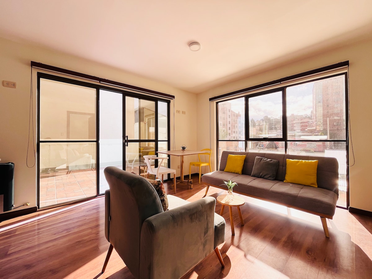 Opplev La Paz fra San Miguel, et av de mest eksklusive, sikreste og beste gastronomiske områdene i byen. Leiligheten vår er fullt utstyrt og har en spesiell touch som få steder tilbyr: en privat hageterrasse, perfekt for å slappe av, lese, drikke kaffe eller bare nyte utelivet. Ideelt for forretnings- eller fritidsreiser, den ideelle orienteringen mot solen gjør det til et veldig varmt sted på dagtid og om natten, et veldig verdifullt aspekt i klimaet i La Paz.