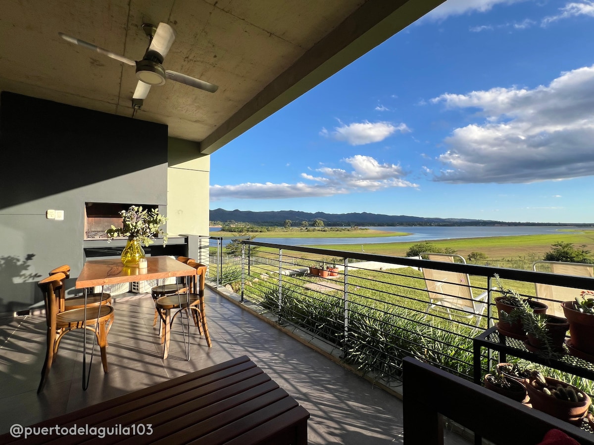 Ubicado en increíble zona sobre lago Los Molinos, en el Country Náutico Puerto del Aguila, complejo "The View". Departamento de dos habitaciones, una con cama matrimonial y otra con dos cómodas camas individuales (cucheta), cocina comedor y balcón con asador. Equipado para pasar momentos únicos en un entorno natural con vista y acceso directo al lago. Este complejo cuenta con seguridad, restaurant, pileta, sala de gym, mesa de billar y pin pon, cancha de tennis y kayaks.