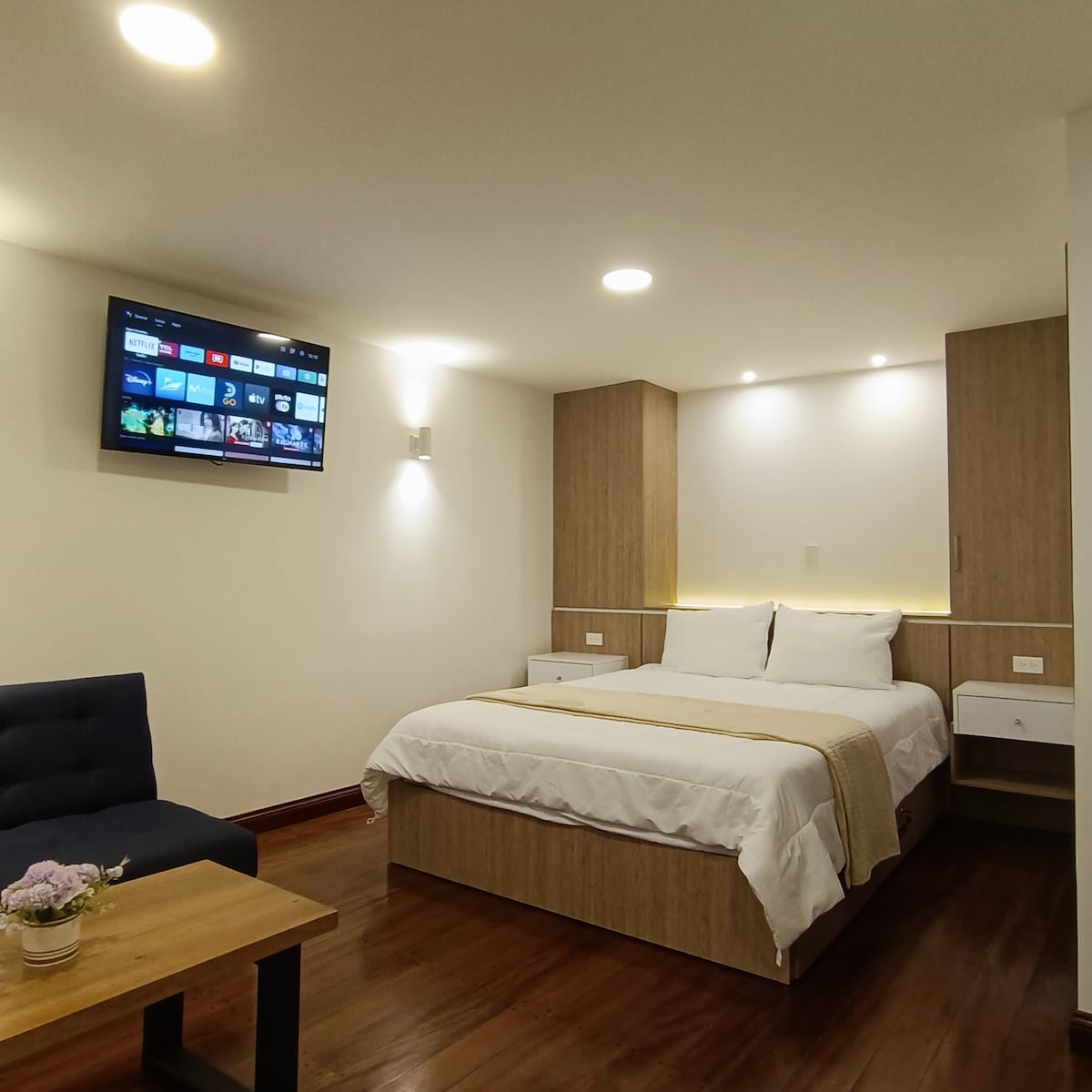 Nyt et komfortabelt opphold i denne moderne suiten i hjertet av det historiske sentrum av Cuenca. Den har et fullt utstyrt kjøkken, et stilig soverom med dobbeltseng, et moderne bad, et barlignende spiseområde og en sovesofa i stuen. Ideell for par eller reisende som ønsker komfort, stil og en førsteklasses beliggenhet, nær restauranter, museer og turistattraksjoner.