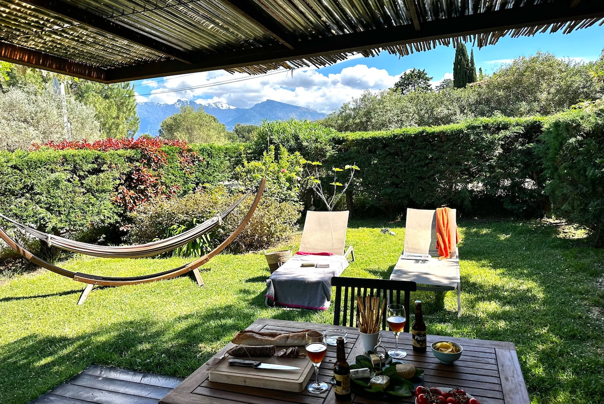 Boligen vår har en fantastisk utsikt over fjellet. Du vil dele et 6X3M svømmebasseng med oss. Stranden er tilgjengelig til fots. Helt renovert av oss, med en unik og raffinert dekorasjon. Du har 2 enkeltsenger på soverommet og en sovesofa 140X190 i stuen. Terrassen er utstyrt med lenestoler, bord, stoler, grill. Isolert i en stor hage vil du være i absolutt ro. Barna og dyrene dine kan bevege seg trygt rundt