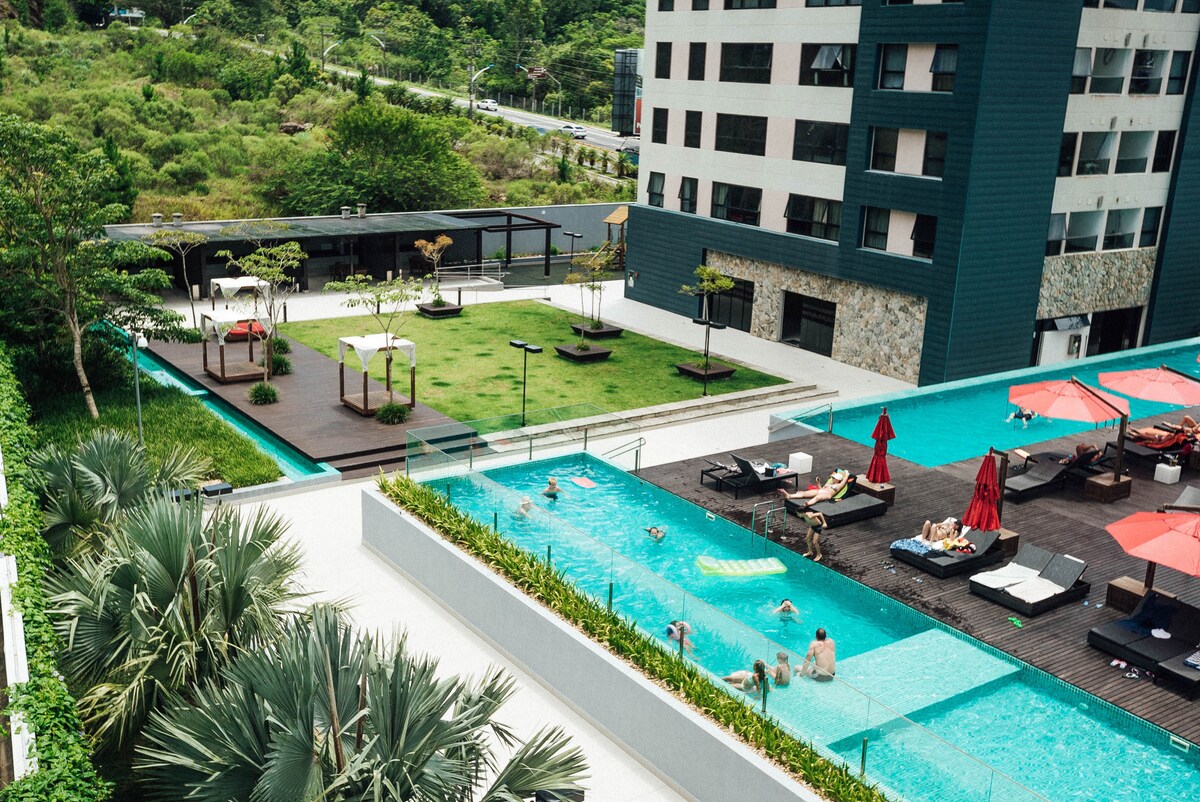Leilighet i privat kondominium med fritidsområde, utsikt over havet (Praia Brava) og naturlig skog for å nyte oppholdet ditt. Kjøkken med ovn, kjøleskap, filter, mikrobølgeovn, redskaper, Nespresso kaffemaskin og vaskemaskin og tørketrommel. Claro TV+ med alle kanaler frigitt – én parkeringsplass (overbygd) – Dyrevennlig (plass til kjæledyr i leiligheten) 6 minutter med bil til Praia Brava hvor du kan finne barer, restauranter og butikker. Perfekt sted å slappe av og nyte den berømte Brava-stranden