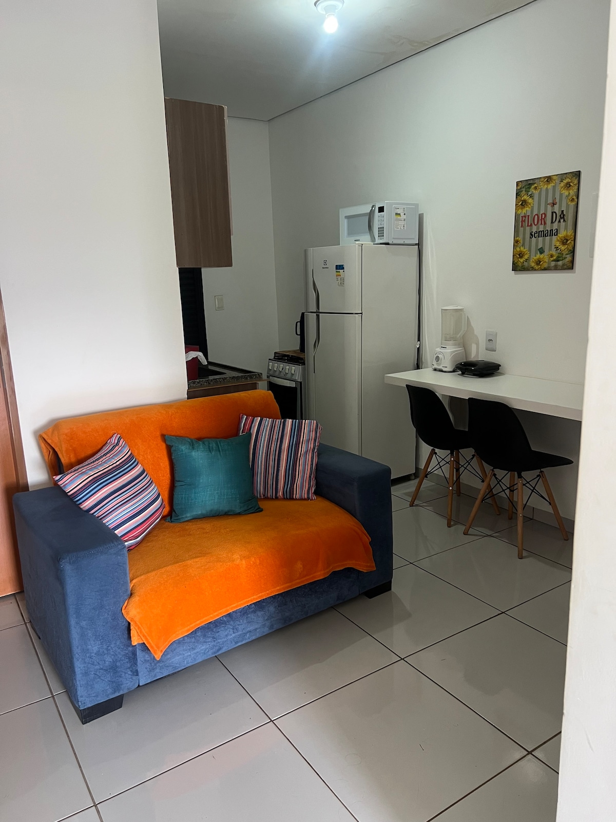 Du bor i et trygt, sentralt leilighetskompleks, i nærheten av alt. Komplett utstyr (seng og bad), eget bad, sikker garasje, minikjøkken med utstyr, kaffetrakter, mikrobølgeovn, elektrisk kokeplate med én plate, gryter, bord med to spisestoler, 43-tommers smart-TV, 12 000 BTU klimaanlegg, takvifte, et flott sted å slappe av. Vi ligger 300 meter fra Praças das Araras. Vi har kvalitets wi-fi, alt du trenger for et rolig opphold.