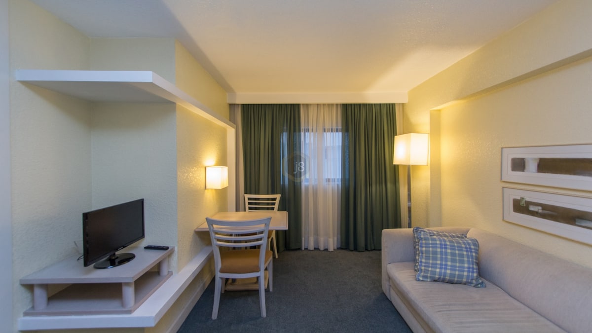 Leiligheten ligger inne i Sky Borges Hotel, med all infrastrukturen: gratis parkering, oppvarmet svømmebasseng, badstue, jacuzzi, barneplass, kroppsbyggingsrom, sv. hushjelp med bytte av sengetøy, bading og rengjøring av rommet (KAMMERPIKER IKKE VASK OPP). Ar, smart-TV 42", kabel-TV, trådløst nettverk og en minicozinha med minibar, elektrisk stekeovn, elektrisk komfyr, luftkoker og mikrobølgeovn. Frokost er ikke inkludert, men kan konsumeres og betales direkte ved utsjekking.