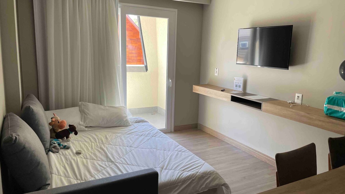 Leilighet som ligger inne i Hotel Sky Borges med all infrastruktur: parkering, innendørs svømmebasseng, badstue, boblebad, barneområde, treningsrom, hushjelp med bytte av sengetøy, bad og daglig rengjøring av rommet (hushjelp vasker ikke opp). Leiligheten har split klimaanlegg, kabel-TV, wi-fi og et minikjøkken med minibar, elektrisk ovn, kokeplate, airfryer, mikrobølgeovn og kaffekapsler av merket 3 corações