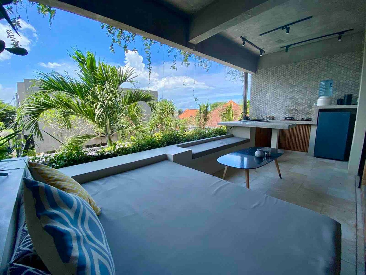 Moderne studioleilighet med ett soverom, kjøkken, eget bad og balkong i sentrum av Canggu. Sammys loftleiligheter og studioer ligger i et rolig område, innenfor en kort spasertur til stranden (med noen av de beste surfestedene og vakre solnedgangene) og mange kafeer, restauranter, strandklubber, spa og mye mer. Våre 15 moderne rom og loftsleiligheter er den perfekte oasen etter en travel dag ute, med pålitelig høyhastighets internett, romslige områder, felles basseng, rengjøring, etc. inkludert.