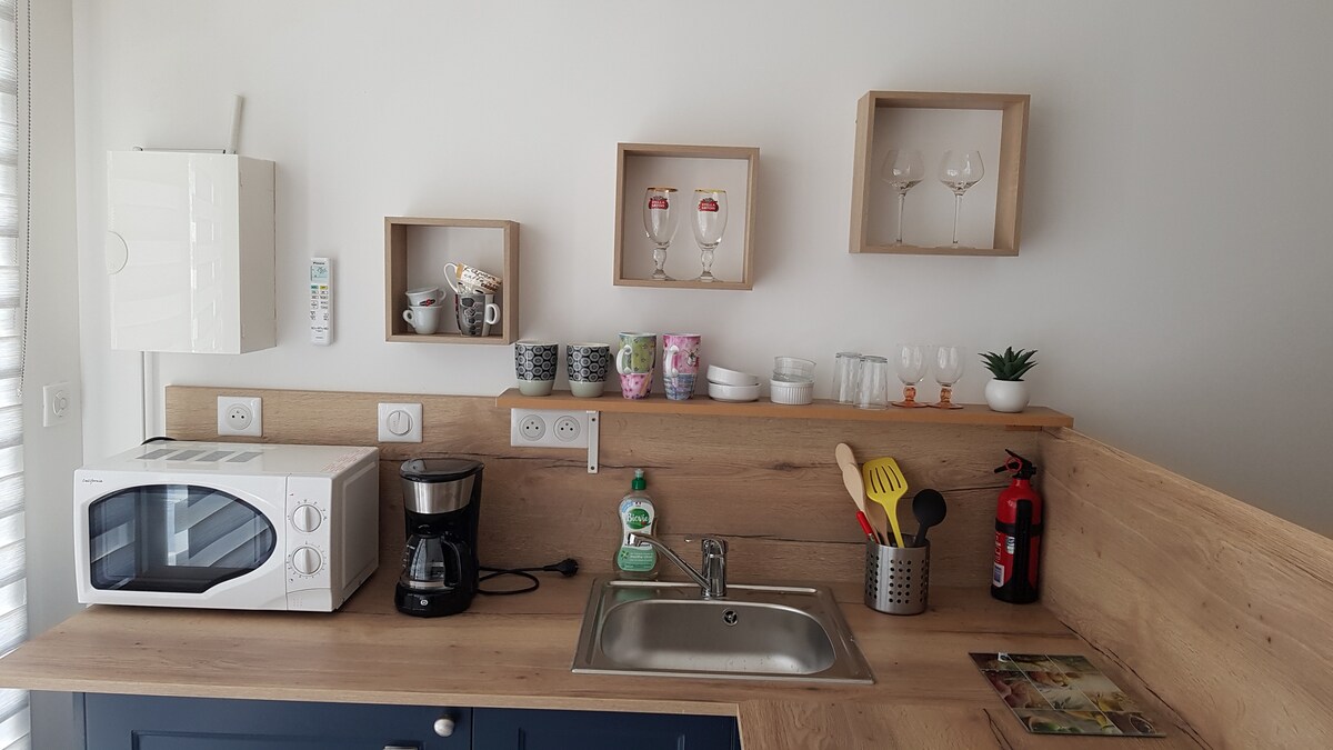 I det private og sikrede området Gaou-Bénat, 200 meter fra stranden, 2-roms bolig på 39 m2 i første etasje, rolig, med terrasse, lysthus i hagen. Utstyrt for 4 personer. Gratis privat parkering. 1 soverom 1 seng 160x200 med komfortabelt madrassbeskyttelse og en sovesofa (ny 2023) i stuen 160x200. For fritidsaktiviteter: overvåket strand i La Favière 300 m unna, vannsport. Privat strand i Gaou-området med parkering, restaurant, dagligvarebutikk, pizzeria. Ladestasjoner for elektriske kjøretøy