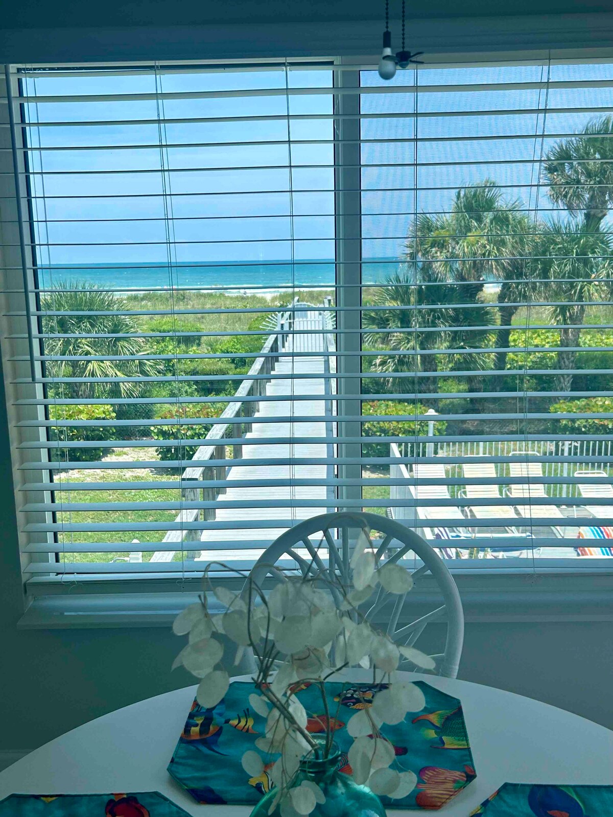 Nyt panoramautsikt over havet fra den private balkongen i denne leiligheten i andre etasje. * Tilgang til privat strand fra bakgården. * Balkong ved havet med komfortable sitteplasser. * Praktisk beliggenhet i sentrum av Cocoa Beach. * Soverom med queen-seng. * Komplett kjøkken. * 2 smart-TV-er med kabel-TV. * Trådløst nettverk uten ekstra kostnad. * Gratis tildelt parkeringsplass. * Komplett bad. * Vaskemaskin og tørketrommel i enheten. * sammenleggbar futon-sofa i queen-størrelse * Strandutstyr og håndklær. * gratis toalettartikler, kaffe og te
