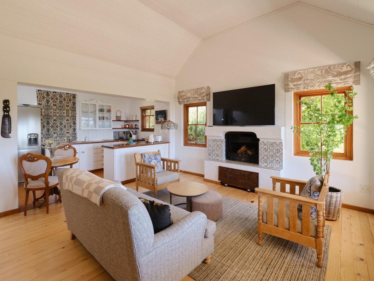 The 4-sleeper, Wingerd comprises 1 room with a double bed and a second room with 2 single beds, sharing a full bathroom. The open-plan kitchen is fully equipped with a fridge, a gas stove, oven, and microwave. The beautiful lounge area has 2 comfortable couches and plentiful with a smart TV, and an extra dining area. The unit opens to a patio with outdoor seating and braai, overlooking the hot tub and surroundings, as well as the kids jungle gym.