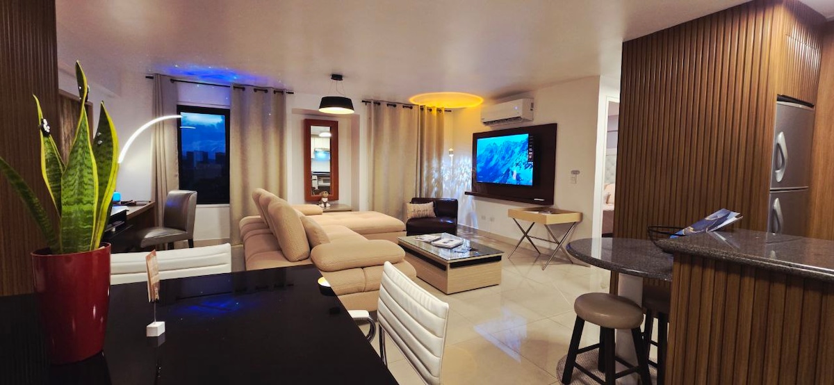 Disfruta de una experiencia con estilo en este alojamiento céntrico. Con una habitación confortable, buena vista a la ciudad, moderno, cómodo, limpio y muy agradable. Ventanas Antiruidos, Contamos con Alexa para que tu experiencia sea única, un espacio que te hará sentir como en casa. Tenemos Internet de 200 megas, Lavadora, Secadora, Aires Acondicionados, Tv de 58" y otro de 50", un Baño remodelado para su disfrute. Una Sala espaciosa y muy moderna. Puedes prender luces, aires y Tv's con Alexa.