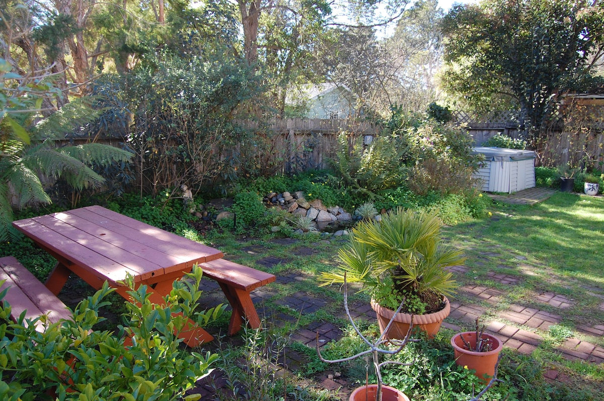 Som kunstner er jeg dypt interessert i estetikk. Jeg tror jeg har lykkes med å skape et vakkert, avslappende sted for avslapning. Queensize-sengen har utsikt over et fuglereservat over Valencia Creek-vannskillet. Kjøkkenet har et kjøleskap fylt godbiter, brødrister, mikrobølgeovn, kaffekanne, fransk press og kokeplate for lett matlaging. Du må gjerne bruke ovnen/komfyren på hovedkjøkkenet etter avtale. En gassgrill i bakgården er tilgjengelig for tyngre matlaging (eller hvis du planlegger å lage fisk!) Hårføner og sjampo er tilgjengelig i det romslige private badet. Tykke frottékåper er tilgjengelig for din komfort, og strandhåndklær og stoler hvis du bestemmer deg for å tilbringe litt tid på en av våre vakre strender. Det er en stor flatskjerm-TV med Netflix. Mye lesestoff og et skrivebord er også tilgjengelig for bruk. Du har egen inngang med kode. Du har egen inngang med kode. Rommene dine er private, og du har din egen veranda, og du er velkommen til å bruke hagen/terrassen. Jeg deler huset foran med partneren min og de to hundene våre. Vi vil gjerne møte deg og kanskje dele en kopp kaffe eller et glass vin (avhengig av tidspunktet på dagen!), men vi respekterer også ditt behov/ønske om privatliv hvis du foretrekker det. Jeg gir deg gjerne informasjon eller fasiliteter som gjør besøket ditt mer komfortabelt og hyggelig. Dette hjemmet ligger i nærheten av de vakre strendene i Monterey Bay Marine Sanctuary og skogen i Nisene Marks, bare en mile fra Aptos landsby, sør for Santa Cruz og Boardwalk og nord for Elk Horn Slough og Monterey Bay Aquarium. Parkering er lett tilgjengelig på vår rolige blindgate. Beleggssteinsstien til venstre for eiendommen vil føre deg til en port og din private veranda/inngang. Oppgi en firesifret kode før du ankommer, så programmerer jeg inngangen for enkelhets skyld. Ingen nøkler å bry seg med. Det er offentlig transport tilgjengelig én engelsk mil fra huset. Uber er et populært alternativ i området. Vi er bare noen minutter unna en blomstrende sentrumsscene med musikksteder og restauranter, shopping, kunstgallerier og SC Beach Boardwalk. Hvalsafari, kajakkpadling, sykling og turstier ligger også bare noen minutter unna. Stedet mitt passer for par, soloeventyrere, forretningsreisende eller de som leter etter et rolig tilfluktssted.