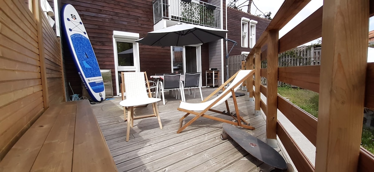 Velkommen til det sjarmerende huset vårt på 67 m², ideelt for å ta komfortabelt imot en familie på fire personer. Den ligger bare tre minutters gange fra stranden og sentrum, og gir deg enkel og rask tilgang til å nyte solfylte dager og spaserturer ved havet. Sengetøy tilbys, og for opphold på 4 netter eller mer tilbys også håndklær. Fiber-WiFi. 2 parkeringsplasser privatrom (sykkel/surfing) treterrasse