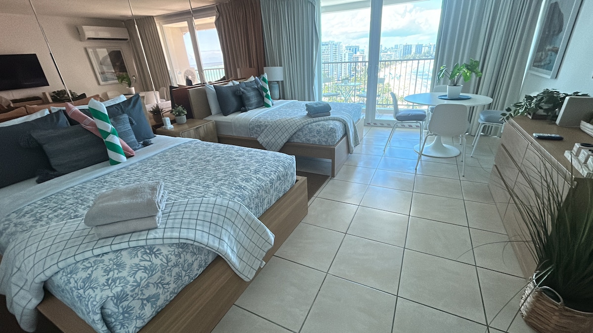 Ny lobbybar!! Gjør for å reparere bassenget er stengt for øyeblikket. GRATIS bagasjeoppbevaring i tilfelle du ankommer tidlig enn innsjekkingstidspunktet eller hvis flyet ditt er senere. HELT OMBYGD BAD og KJØKKEN. Esj Azul PH !! Vakker leilighet med ett soverom i hjertet av isla verde. Direkte tilgang til stranden,pustende strand og utsikt over flyplassene,kasinoer og restauranter. Smart TV i soverommet og smart i stuen med kabel-TV, gratis trådløst nettverk, GRATIS nummerert parkeringsplass, spillrom, treningsstudio.