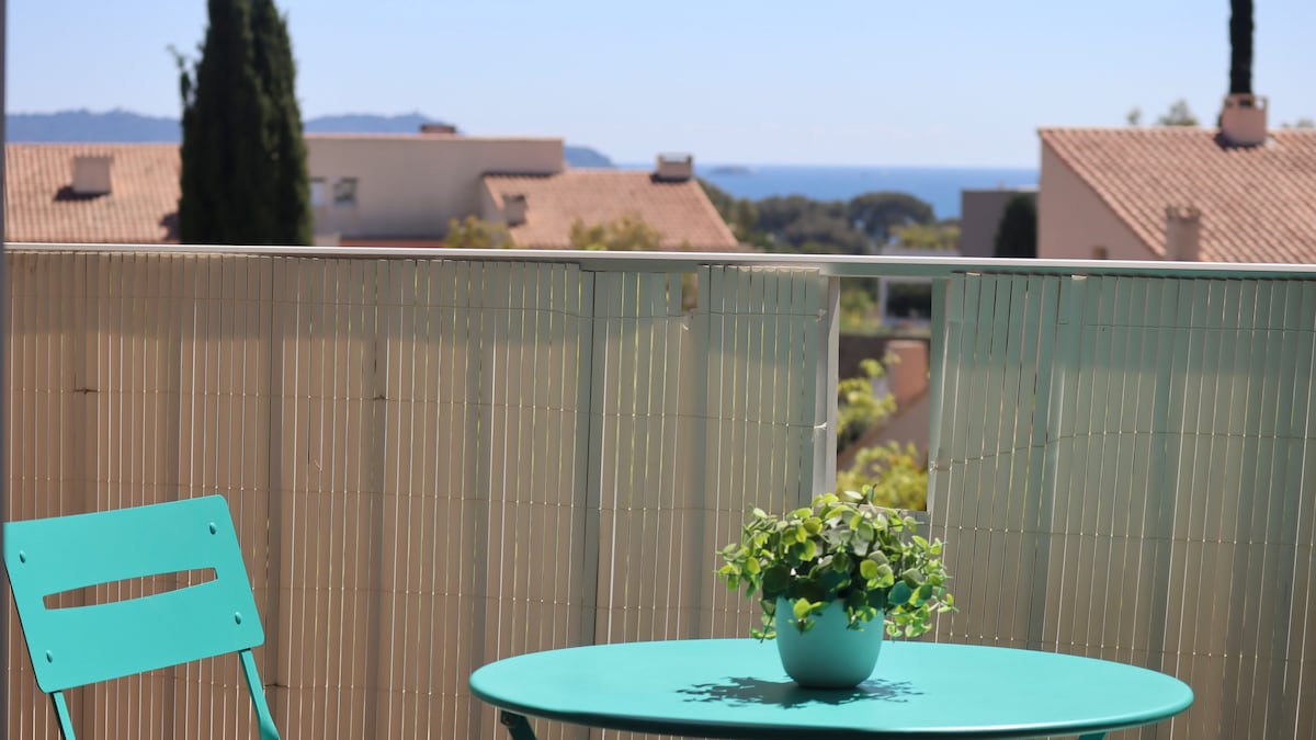 Un Refuge Intimiste entre Pinède et Mer Imaginez une parenthèse à deux, suspendue entre le vert des pins et le bleu infini de la Méditerranée... Nichée au cœur d'une pinède préservée, notre villa comprend ce studio moderne et climatisé qui a été pensé pour votre confort. Dès votre réveil, laissez-vous transporter par une vue spectaculaire : de votre terrasse, le panorama se dévoile sur la Presqu’Ile de Giens et les célèbres Îles d’Or, avec Porquerolles en majestueuse toile de fond.