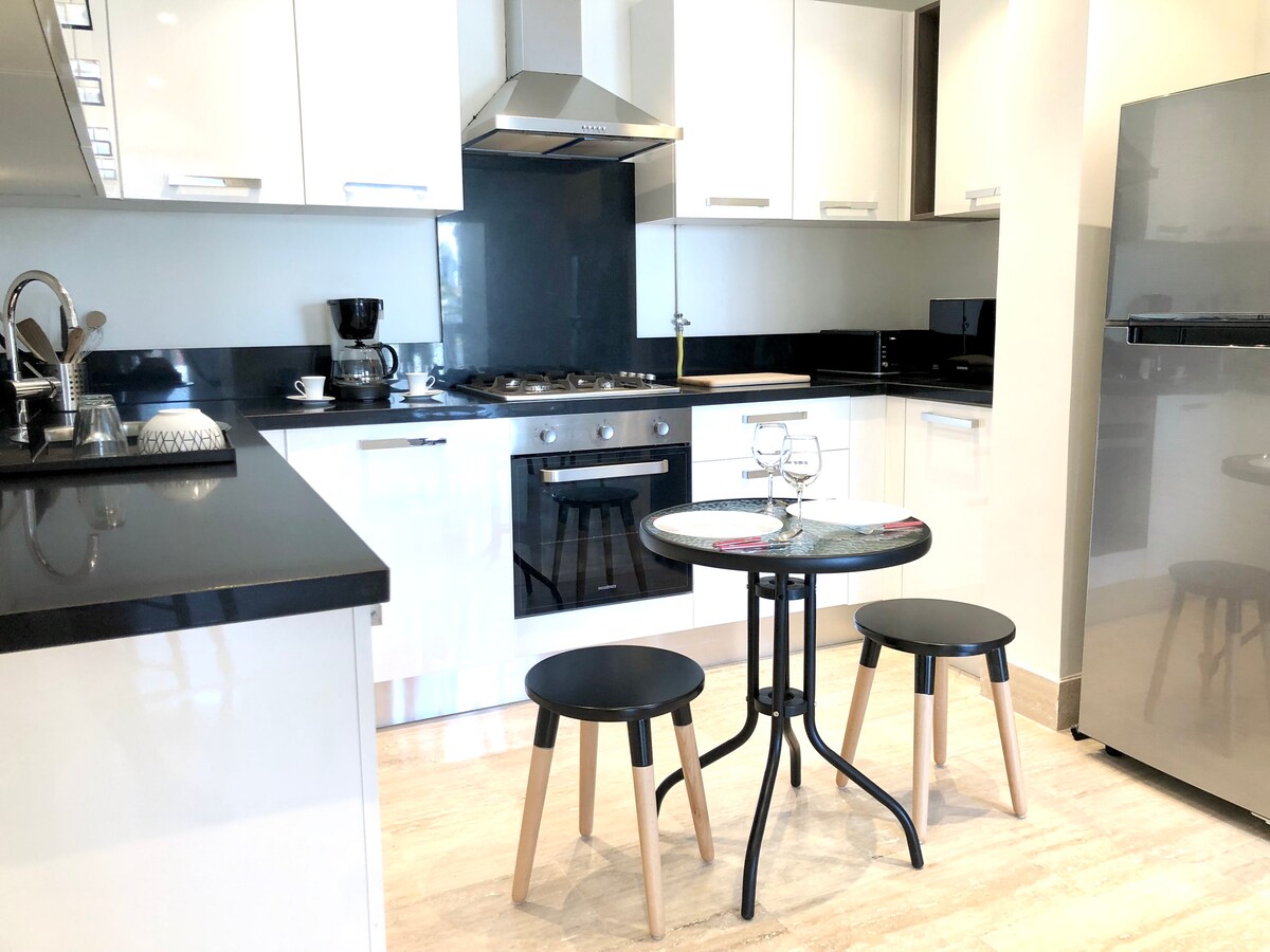 Enjoy a newly constructed, modern and stylish apartment at a centrally-located place in “Banlieue”. Its tooth picked design and decoration makes your stay on whole another level. Just kick back, relax in this calm, stylish space and let us “serve” you. By car: 4 min to Marsa Corniche and beach, 5 min to Sidi Bou Said and Gammarth, 8 min to Lac II, 13 min to the Airport, and 15 min to downtown Tunis. Walking: Coffee shops, bakery, pharmacy… One of the best and sought after location.