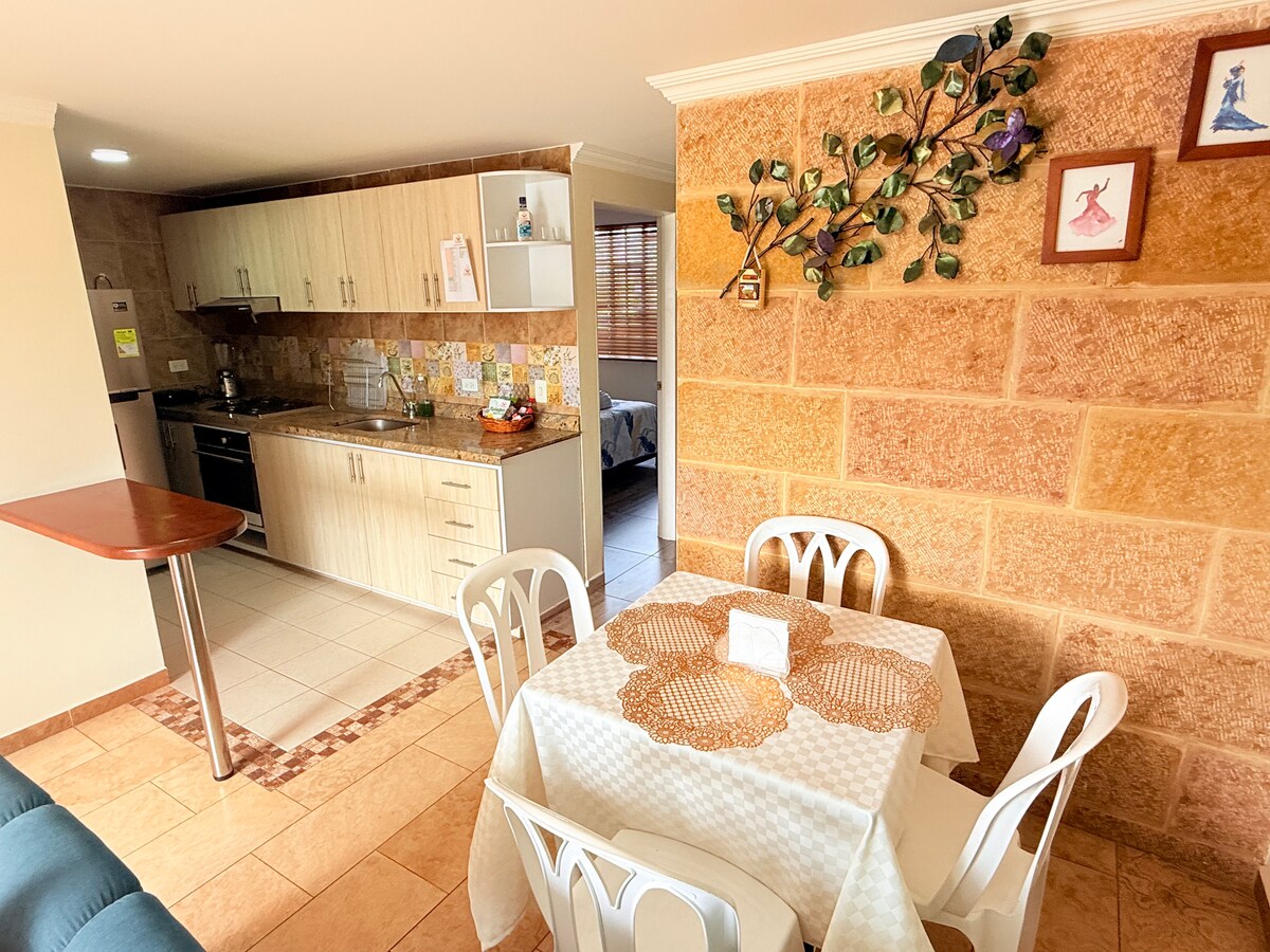 Nyt et rolig og komfortabelt opphold i denne koselige leiligheten, bak Alcaraván kjøpesenter, fullt utstyrt, i første etasje. Ideell for familieturer, fjernarbeid eller hvile. Den har klimaanlegg i stuen og på hovedsoverommet, smart-TV, Netflix og trådløst nettverk. Kjøkkenet er fullt utstyrt. Et halvt kvartal unna finner du en spiseplass, supermarkedet Éxito, treningsstudioet Smartfit, samt Alkosto, en lekeplass og kino noen kvartaler unna.