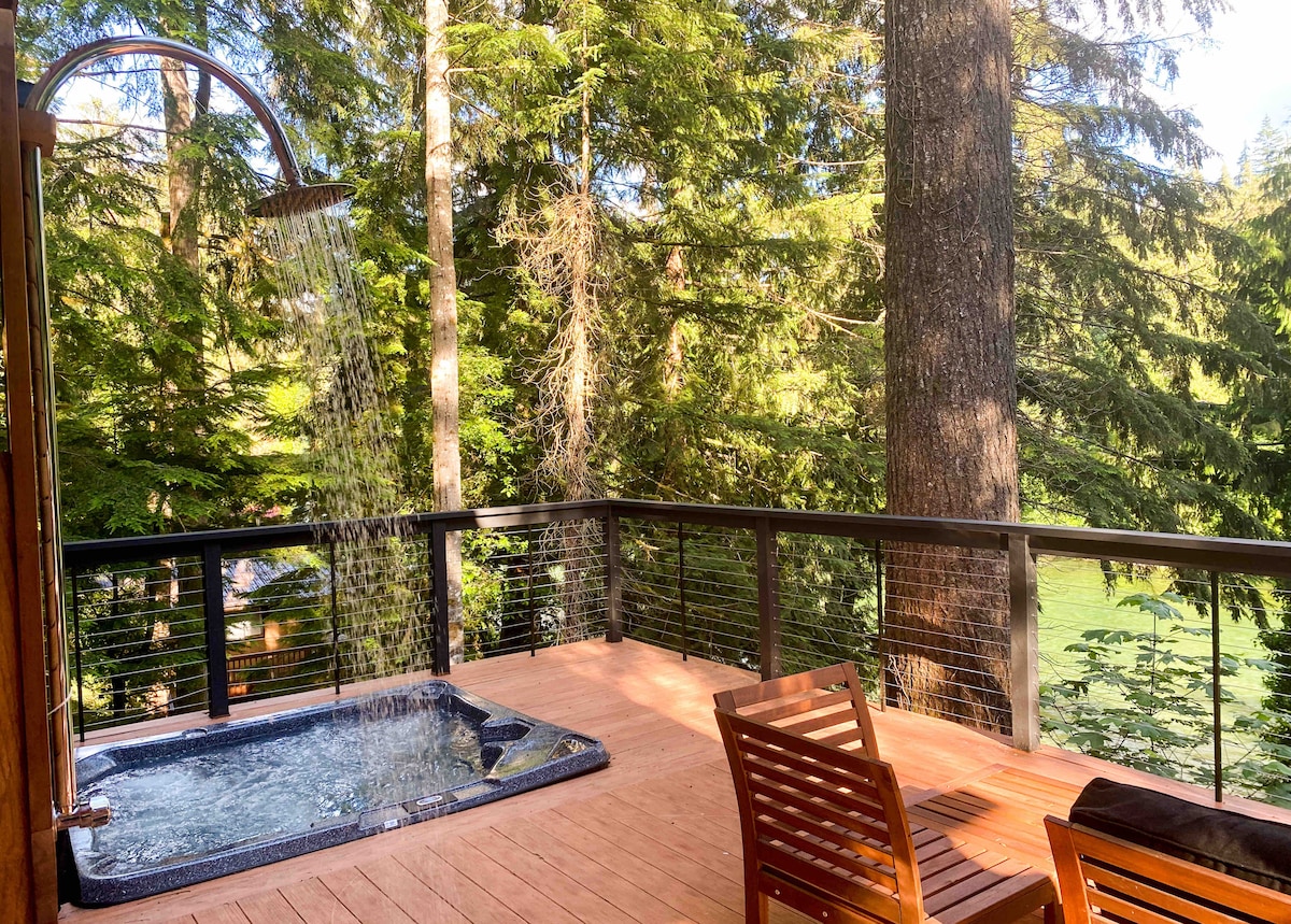 Dette spesialdesignede tretopphuset ligger i en rekke 100 år gamle Douglas firer, og tilbyr alle fasilitetene du forventer i en luksuriøs Mount Rainier-ferie mens du fordyper deg i den avslappende skjønnheten i skogen ovenfra. Les en bok på loftsleiligheten ovenpå, kos deg foran peisen for å se favorittfilmen din, eller finn inspirasjon ved skrivebordet. Tretopphuset ligger på sin egen halv hektar store private skog - tretopphuset ligger i gangavstand fra lokale bedrifter.