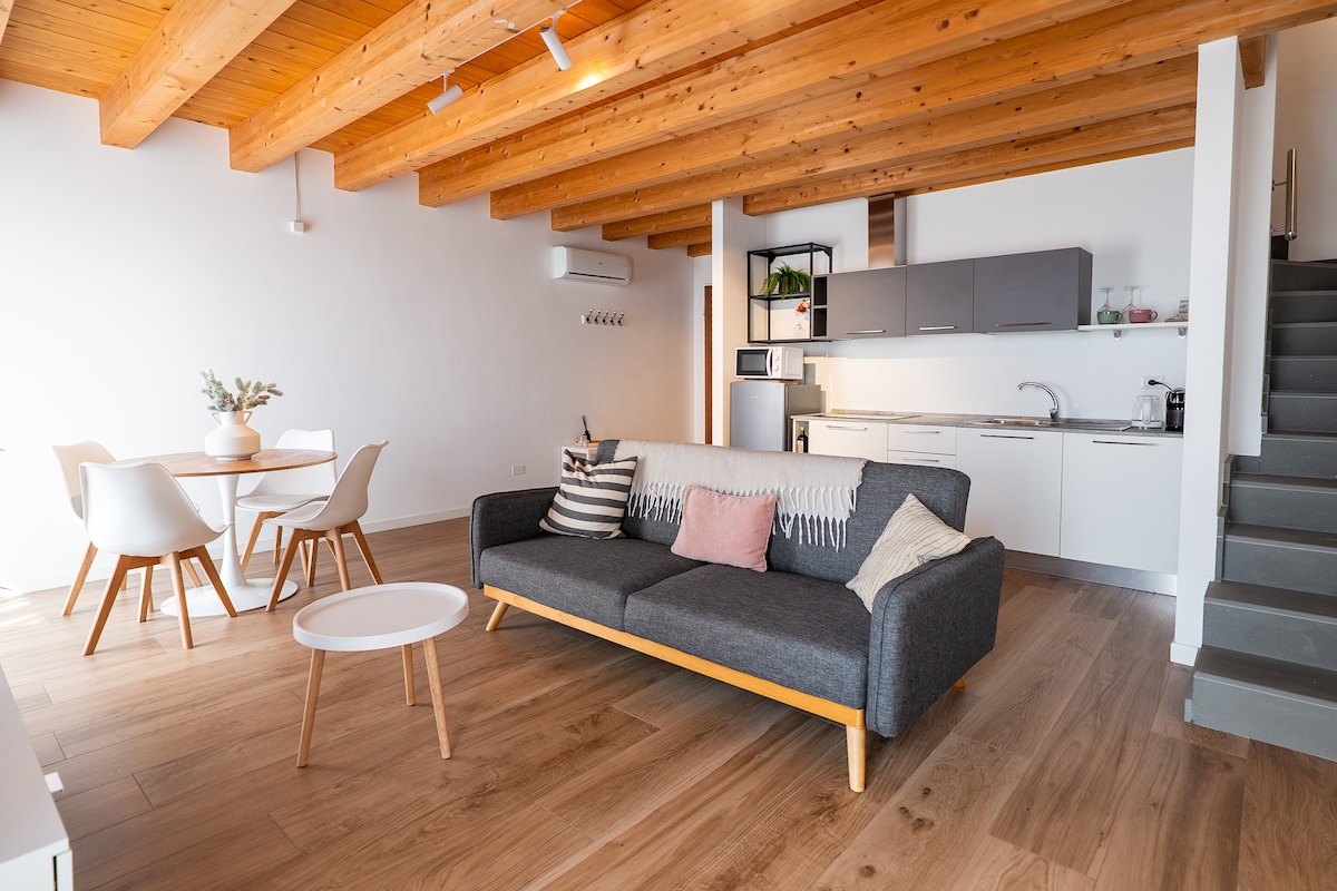 Nyt hjemmet vårt, en designleilighet, hvor ikoniske møbler blandes med vintage detaljer. Den er nylig renovert, og har tre store soverom og tre nye, uavhengige bad. I andre etasje har en stor balkong utsikt over landsbyen Garda og Rocca. I andre etasje skaper et stort vindu et unikt miljø mellom den åpne stuen, terrassen, himmelen og innsjøen. Leiligheten vår ligger fem minutters gange fra innsjøen, og den har en eksklusiv permanent parkeringsplass.