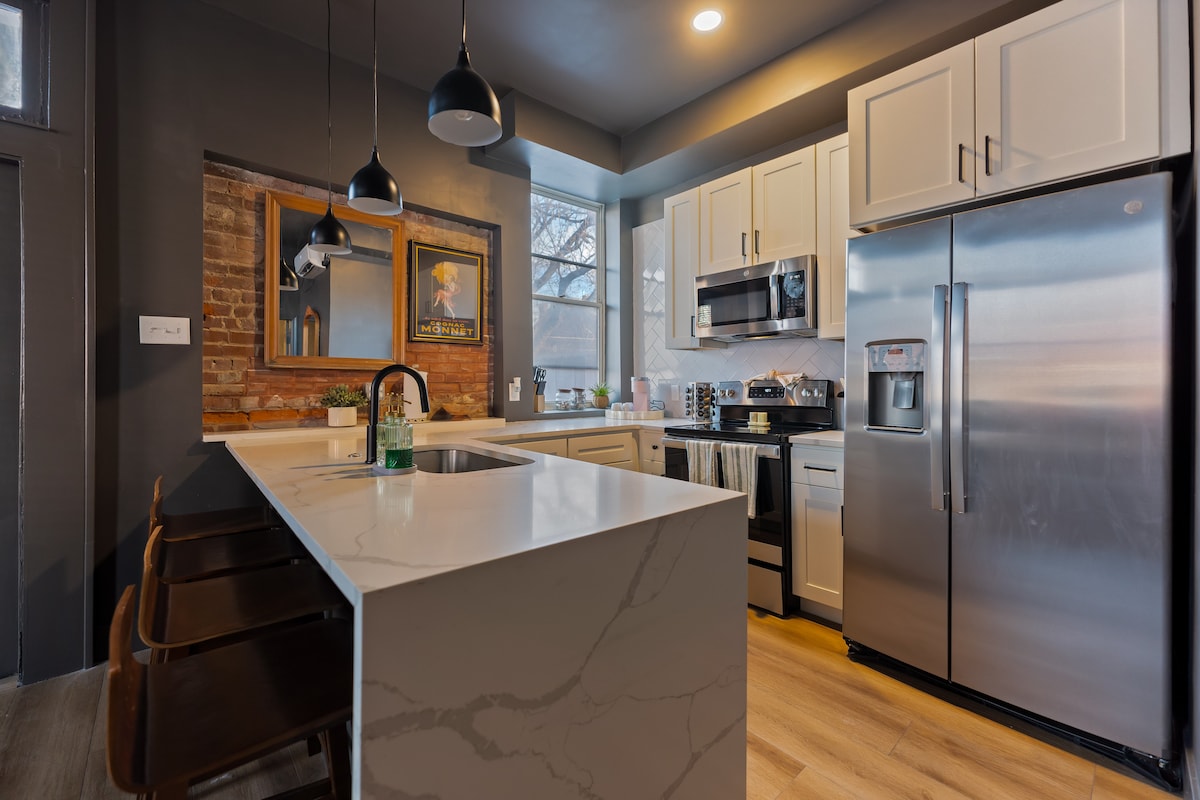 Have fun staying at the stylish Green Oasis of Belleville. Enjoy a spacious stay with two bedrooms, one bathroom, and garage access. - Contact-Free Entrance and Check In - One California King in the Primary bedroom and two twin beds in the spare bedroom with a futon couch. - Cozy kitchen equipped with fridge, microwave, stove and more. - Shared laundry room. Access to a washer, dryer, detergent and hamper for your convenience.