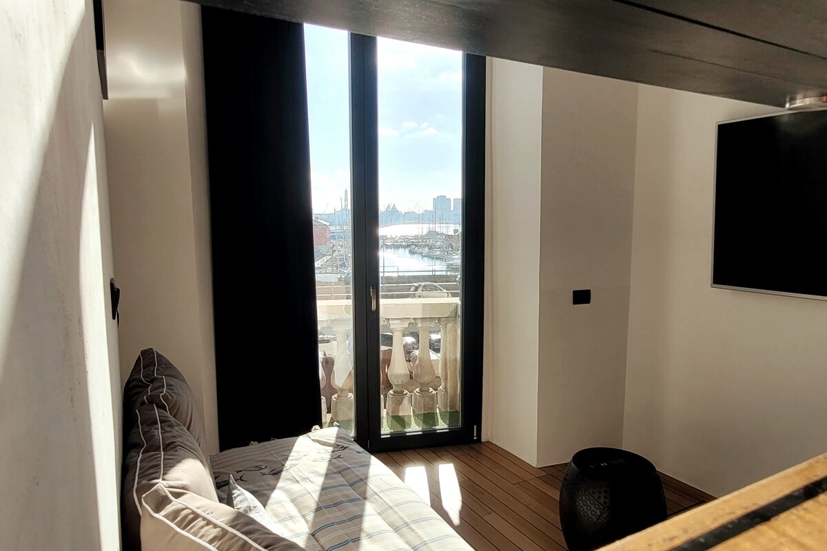 Yacht, designloft med utsikt over sjøen/havnen, akvarium