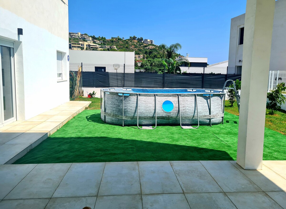 Et sted med grøntområder og ro, 15 minutter med bil til stranden, vakker leilighet på 145 m2 i duplex med to terrasser, svømmebasseng, grill, wifi, i en privat og sikret golfbane. Drikkevann filtrert ved omvendt osmose. Smakfullt dekorert, ideelt for store familier, med fotballbord, Play Station 3 (ta med egne kontroller) og spill og bøker for barn. Tilgang til golfbane i umiddelbar nærhet (køller tilgjengelig på forespørsel), tennis, padle, fotball, sykkelsti og gangsti.