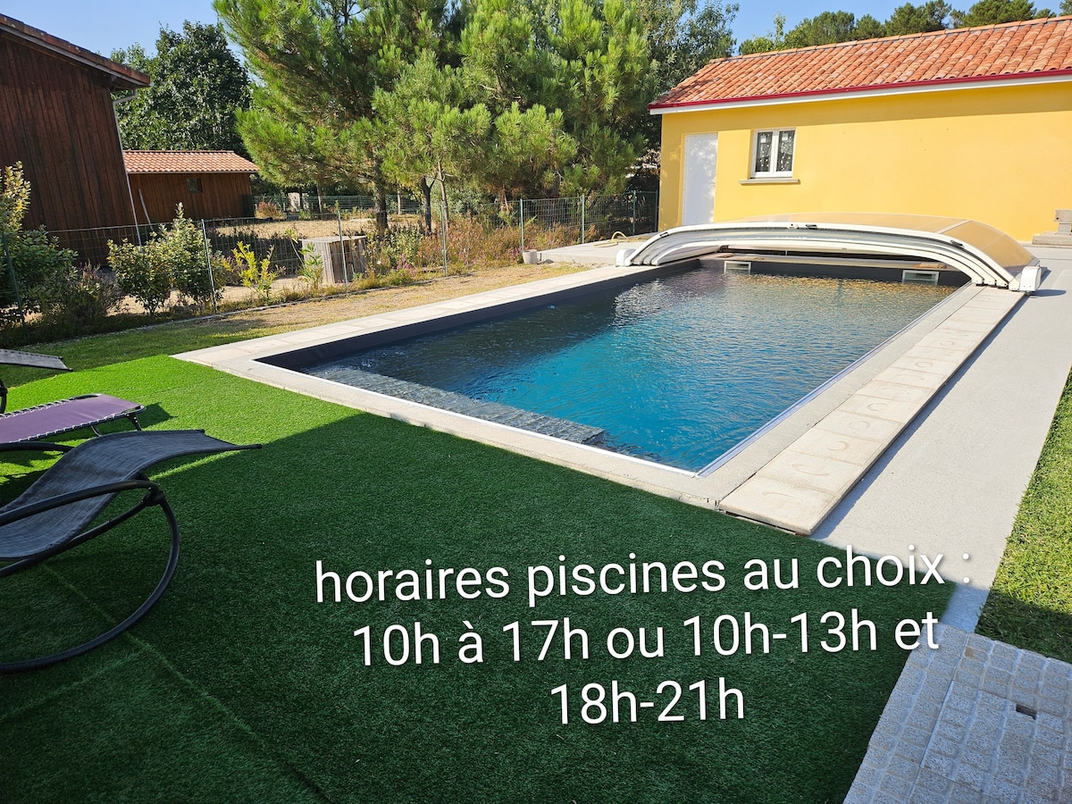 Nytt hus omgitt av skog ved siden av sykkelveien og strendene på Landes-kysten Den består av en stue med åpen kjøkkenløsning, 3 soverom, inkludert 1 master-suite med bad og toalett, og et annet bad og separat toalett. Fiberinternett 🛜 Ute er det et basseng vendt sørover på 4 x 8,5 m oppvarmet fra april til 11. november med anlagt hage og 110 m2 treterrasse. Strand og golf i Moliets og maa 10 minutter unna Vieux boucau 15 min Hossegor 28 min. Biarritz 50 min
