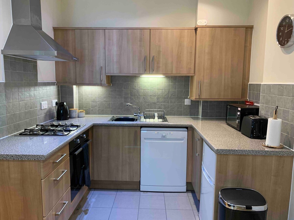 Nydelig leilighet i første etasje med gratis parkering i et moderne, lyst rom. Nyt superraskt fiberbredbånd, en 75" TV med Sky og Netflix, og høye tak. Bare 15 minutters spasertur til Barbican, 20 minutter til sentrum og 2 minutter til butikker og restauranter. Bestill med Deliveroo, Uber Eats eller Just Eat. Overvåkningskameraer ved inngangspunkter, innsjekking uten vert med nøkkelboks. Perfekt for familier, par, enslige reisende eller forretningsreisende!