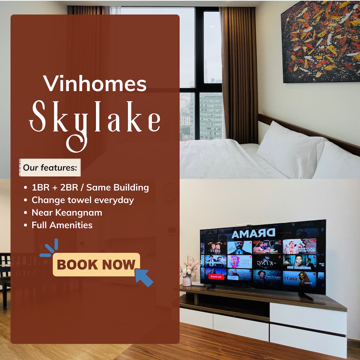 Leilighet på Vinhomes Skylake med en superavslappende utsikt over byen. Du kan spasere til Landmark72 og InterContinental, bare 1,2 km til The Manor, og i nærheten av det travle koreanske byområdet. Bygningen har et kjøpesenter nede med restauranter, kafeer, K-Mart og Winmart. ★ Rent og luftig rom ★ Praktisk innsjekking uten vert døgnet rundt med smartlås Sterkt og stabilt trådløst nettverk. Gratis Netflix, privat vaskemaskin, fullt utstyrt kjøkken og byguide. ★ Kundestøtte for turbestilling til rabatterte priser