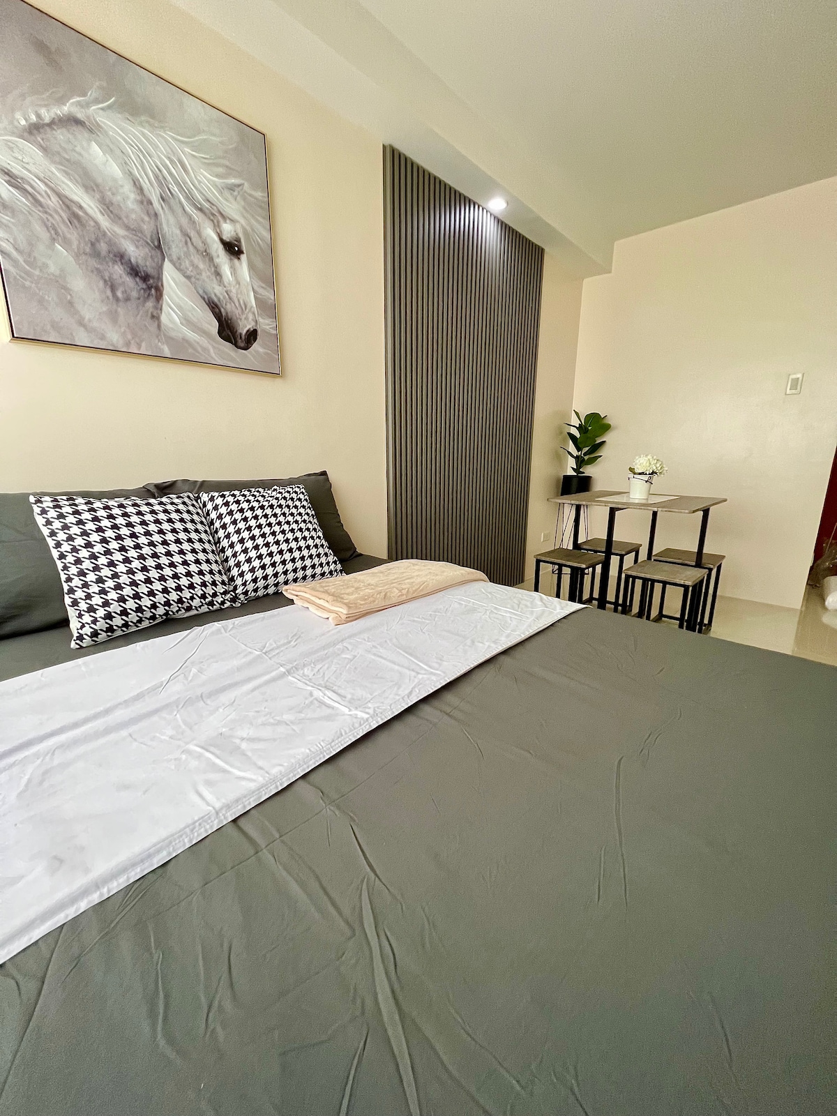 Velkommen til vår inspirerte studioenhet fra midten av århundret i hjertet av Cebu City. Med sakkosekker, regndusj, kaffehjørne og en PS5, tilbyr dette koselige stedet både komfort og moro. Se Netflix på 65-tommers TV, les en bok, drikk kaffen, nyt den fantastiske utsikten over CCLEX-broen og føl deg som hjemme. Den har plass til opptil tre gjester - fire hvis det er greit for deg å klemme deg inn. Den har en førsteklasses beliggenhet, så du er bare noen minutter unna de beste kjøpesentrene, næringsparkene og Cebu's mest populære steder.