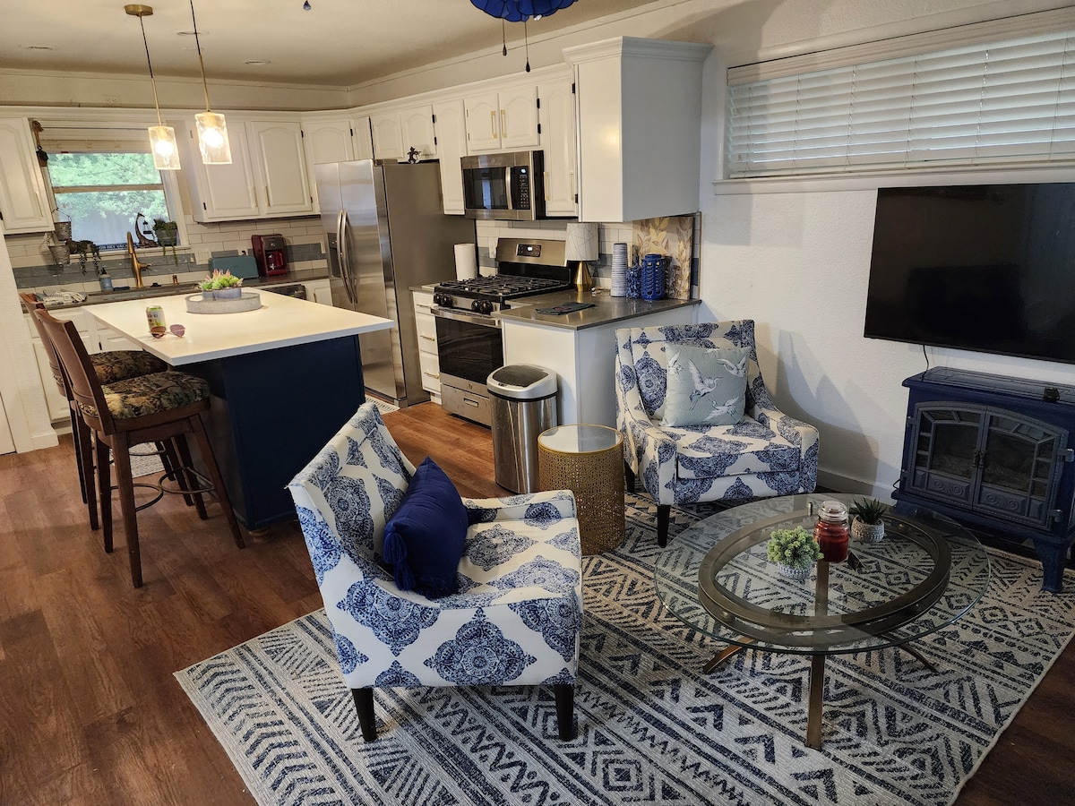 Velkommen til fred og ro i livet på landet! Senk farten litt og nyt dette romslige og komfortable tilfluktsstedet fra byen, som ligger på 38 hektar med vakre beitemarker og skogsstier, bak hovedhuset. Funksjonene inkluderer et fullt kjøkken med Keurig kaffemaskin og grunnleggende matlagingsutstyr, romslig stue og samtaleplass.