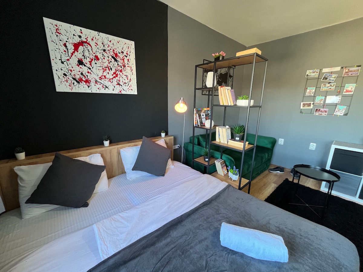 Opphold på fire netter eller mer inkluderer gratis henting eller levering på flyplassen! Vennligst be om det på bestillingstidspunktet!!! Et nytt studio i et svært attraktivt og sentralt nabolag. Den sentrale busstasjonen ligger ett minutts gange unna, og du er ca. 10–15 minutters gange unna de mest kjente landemerkene i Skopje. Du kan ikke slå dette stedet! Denne leiligheten er moderne og stilig, fylt med gjennomtenkte detaljer for maksimal komfort etter en lang dag med utforskning av Skopje! Unikt, akkurat som deg! Er det ikke superkult?