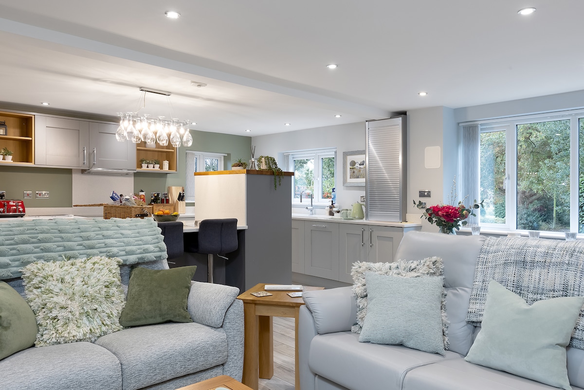 Denne fredelige beliggenheten på landet, rett utenfor døren til fasiliteter, puber, turstier og steder av interesse, er en idyllisk ferie med privat utendørs balkong takterrasse. Åpen planløsning i første etasje med fullt utstyrt kjøkken. Separat vaskemaskin og tørketrommel. Toalett i underetasjen. Låst overbygd sykkeloppbevaring, 1 x king size, 1 x soverom med dobbeltseng i 1. etasje. Luksusbad med tøffelbad. Dedikert arbeidsplass med 43" skjerm. To private parkeringsplasser med elbil-lader er inkludert.